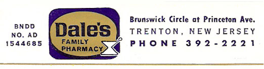 The pharmacy was part of Dales, a store that opened in the summer of '66 on Brunswick Circle. Dale's closed in the mid- to late-70's. Today the N.J. State Lottery offices occupy the site. In an amazing transformation, what was, in the Dales era Trenton, NJ has today become Lawrenceville, NJ, according to "location" information on the State Lottery's web page. Another example of the area's aggressive de-Trentonization over the last 30 years. |