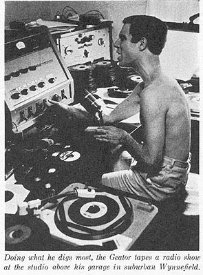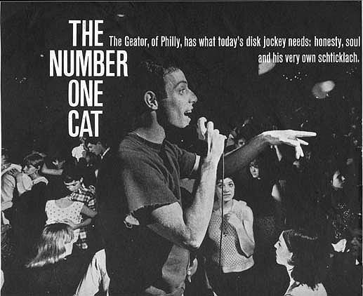 We took a coffee break. . . . At the table the Geator seemed anxious to block out the TV show and talk about radio. He said he had built his show by digging out Oldies that had never made it, with sayings such as "Fresh from the hot heater" (car heater), by standing firm against format radio, and most of all by sensing the special musical appetite of the hip Philadelphia teenagers . "If I don't dig it," the Geator said, "it could be my father out there grooving on the record and I won't play it." It had been hell during the Beatle reign, when there had been much pressure to get on the bandwagon. "But I sensed that it just didn't have enough soul for my kids. The Stones, yes, the Beatles, no. So I'd go up to Fonzo's Restaurant and the upper-class kids would say how come no Beatles and I'd say it's just not my schticklach, not my groove, not for my kids. So I finally gave in and played a few, and I got bombarded by phone calls saying 'Geator, what you doing, man?" . . . "Where the re-action is" might very well serve as his slogan," said Warren Weiner.