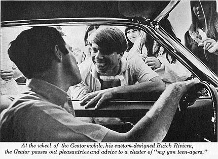 I talked to some of the teenagers in the audience who said they liked the Geator because (1) he was rich, yet didn't wear fancy clothes; (2) he was really one of them; (3) you could really call him if you were in trouble; (4) he really knew what it was like; (5) he was much better than their folks to talk to; and (6) he stood up against the English thing.
